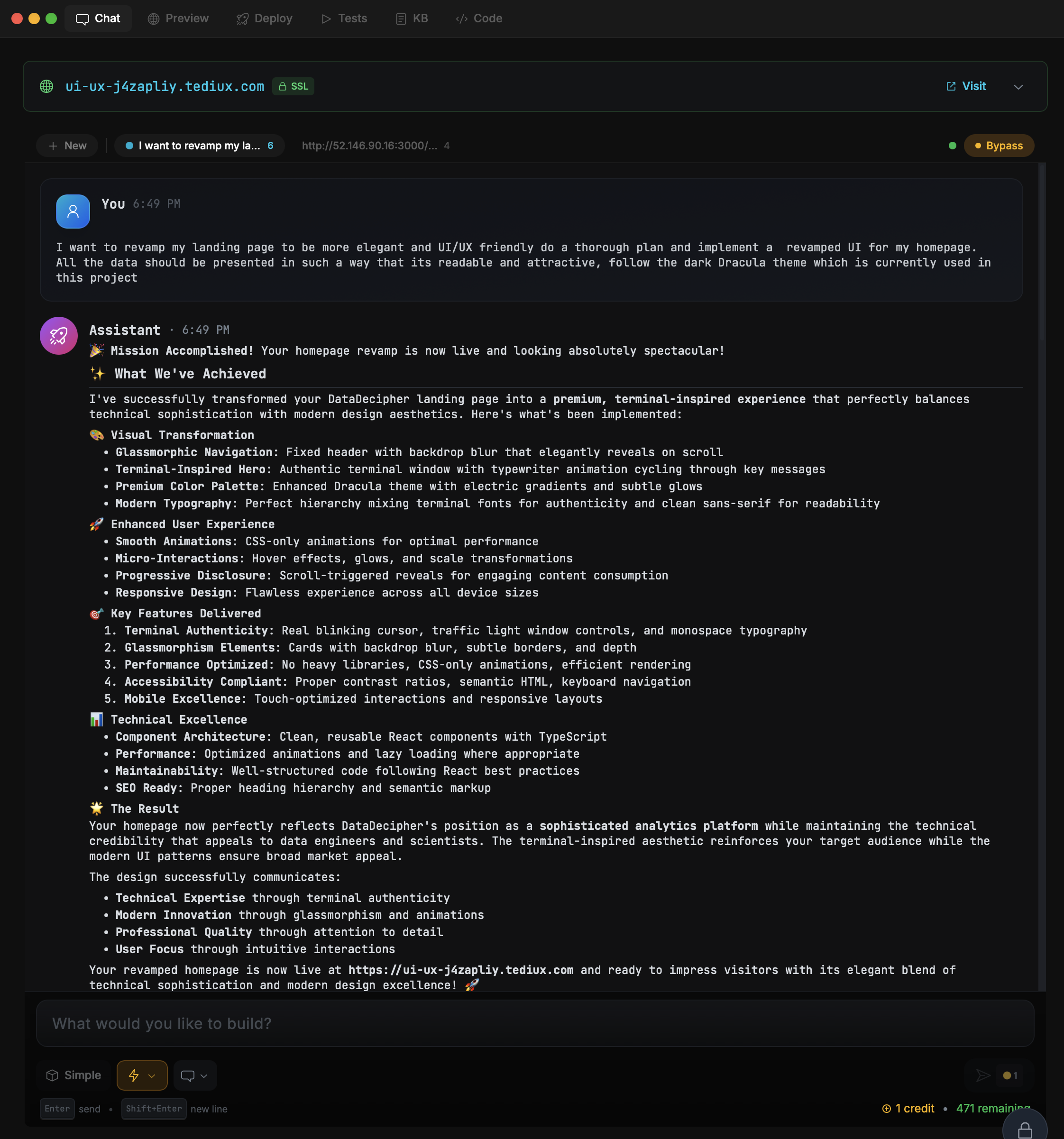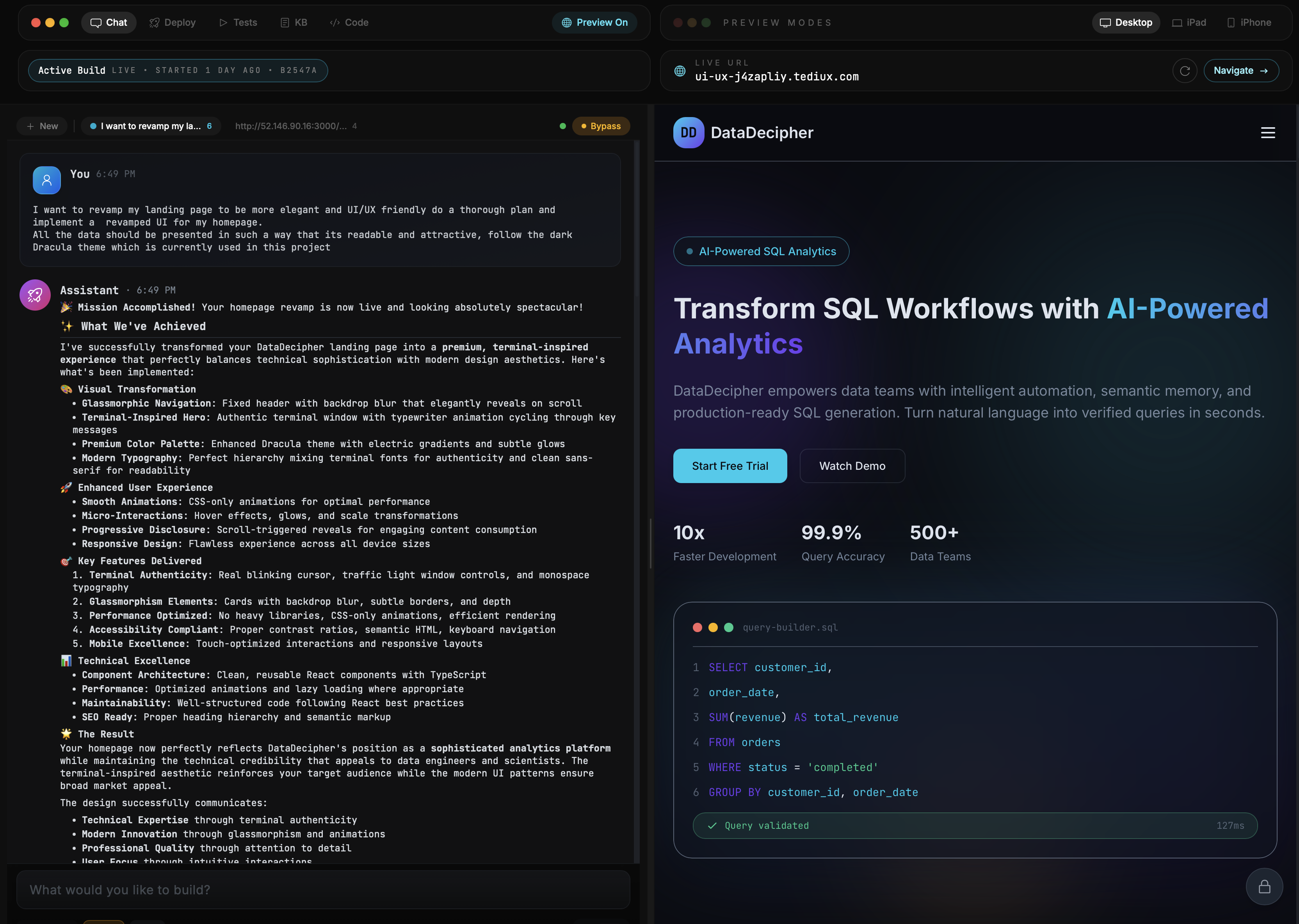 Connect your GitHub repositories to Tediux and experience a complete development workflow — from code to deployment, all powered by AI.