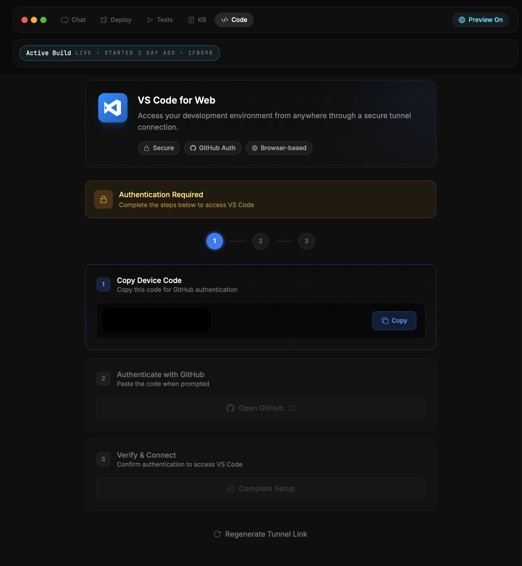 Full IDE — Complete VS Code with all features Extensions — Install and use your favorite extensions Terminal — Access the integrated terminal Git Integration — Commit and push directly from VS Code Secure Tunnel — Encrypted connection to your project Complete Workflow